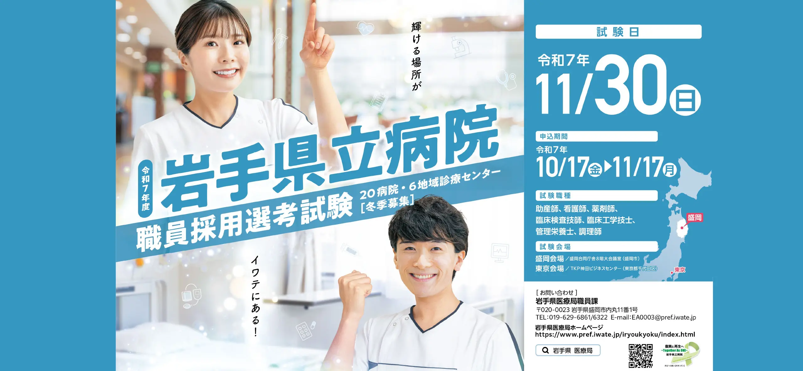 お知らせ 2025/10/17岩手県立病院職員採用選考試験受験案内を掲載しました 2025/2/6令和7年度採用試験日程を掲載しました。 イベント情報 2025/7/17【終了】8/30(土)【THEいわてDAY2025】へ看護・医療職U・Iターン相談ブースへ出展します。 2025/6/20【終了】8/24(日) 岩手県立病院WEB就職説明会を開催します。