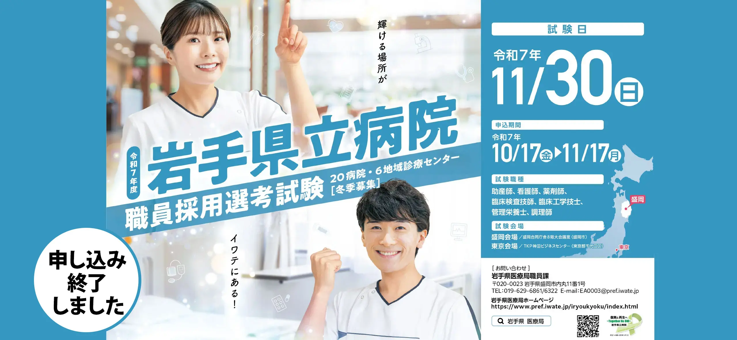 お知らせ 2025/10/17岩手県立病院職員採用選考試験受験案内を掲載しました 2025/2/6令和7年度採用試験日程を掲載しました。 イベント情報 2025/10/30【終了】マイナビ インターンシップ&キャリア発見フェア 薬学生 (仙台会場 11/3(月))へ参加します。 2025/10/25高校生向け「病院のお仕事」紹介を開催します。 2025/7/17【終了】8/30(土)【THEいわてDAY2025】へ看護・医療職U・Iターン相談ブースへ出展します。 2025/6/20【終了】8/24(日) 岩手県立病院WEB就職説明会を開催します。