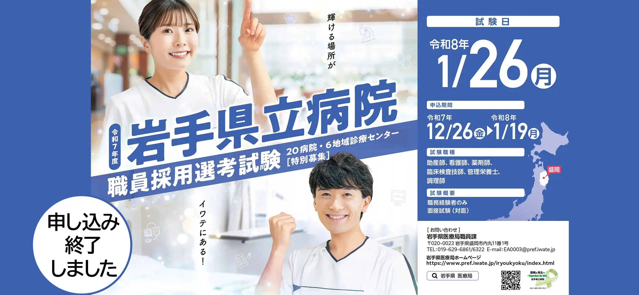 お知らせ 2025/12/26【申込終了】岩手県立病院職員採用選考試験受験案内を掲載しました 2025/2/6令和7年度採用試験日程を掲載しました。 イベント情報 2025/12/8岩手県立病院就職セミナー(Zoom開催)を行います