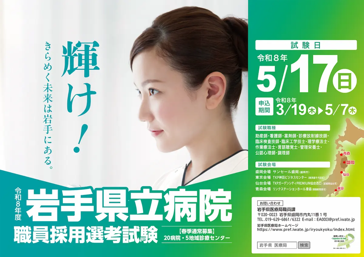 お知らせ 2026/3/19岩手県立病院職員採用選考試験【春季通常募集】受験案内を掲載しました 2026/2/12令和7年度職員採用選考試験【特別募集】合格発表 2025/2/6令和7年度採用試験日程を掲載しました。 イベント情報 2026/3/11岩手県立病院就職説明会(Zoom開催)を行います