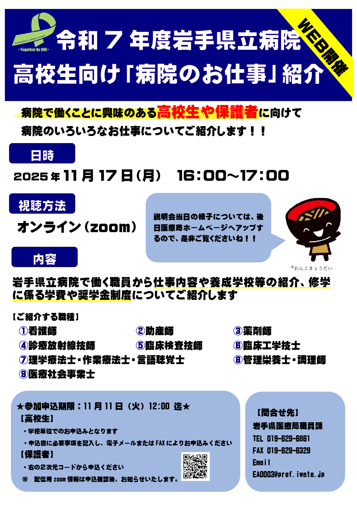岩手県医療局では、高校生や保護者の方々を対象に病院で働く医療職についてご紹介します。